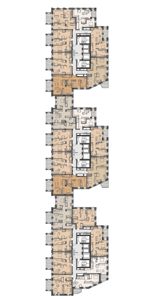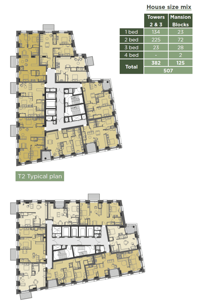 The number of dual aspect homes has been maximised as far as possible with 63% dual aspect in Towers 2 and 3 and 65% dual aspect in the Mansion Blocks.